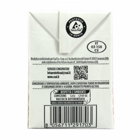 | Indirizzo | Prodotto e confezionati da Alinor S.P.A. nello stab. di via Vittorio Veneto 1/C, Ripalta Cremasca (CR) per Coal Soc. Coop. a r.l. Via Direttissima del Conero, 11 – 60021 Camerano (AN) |